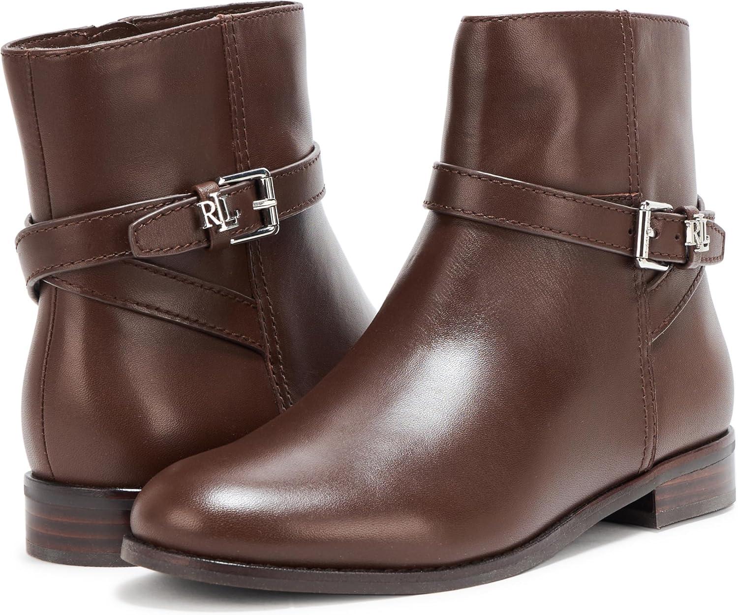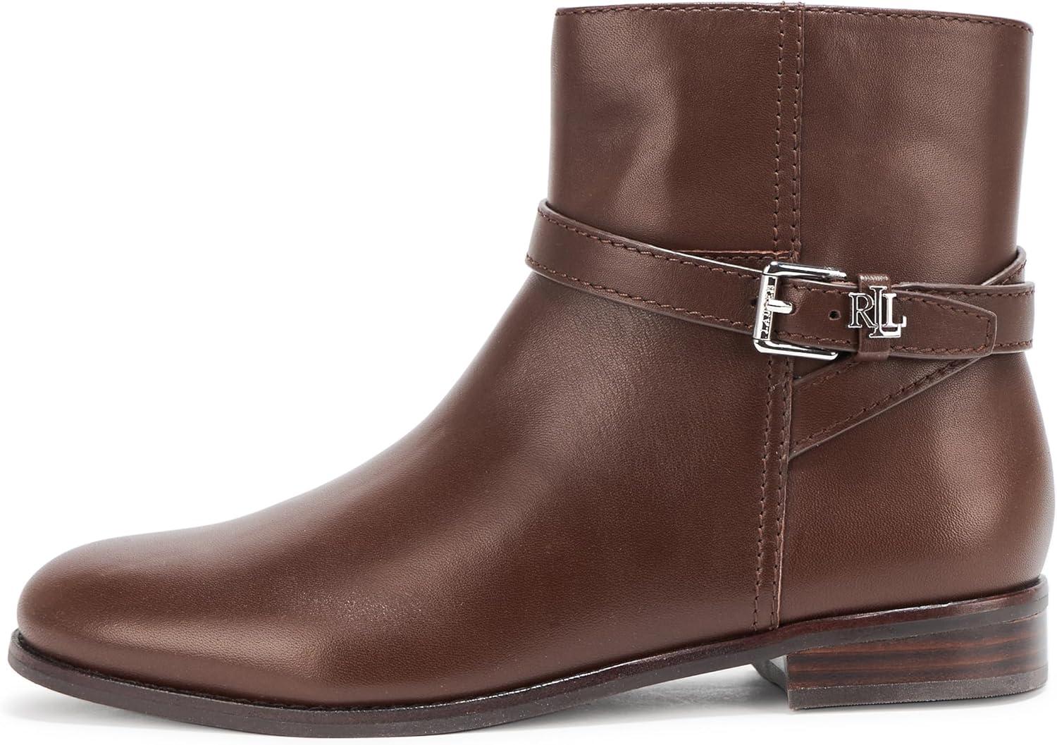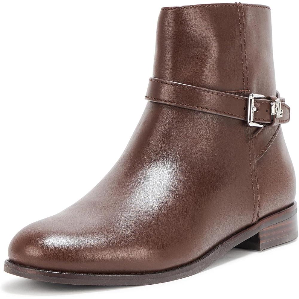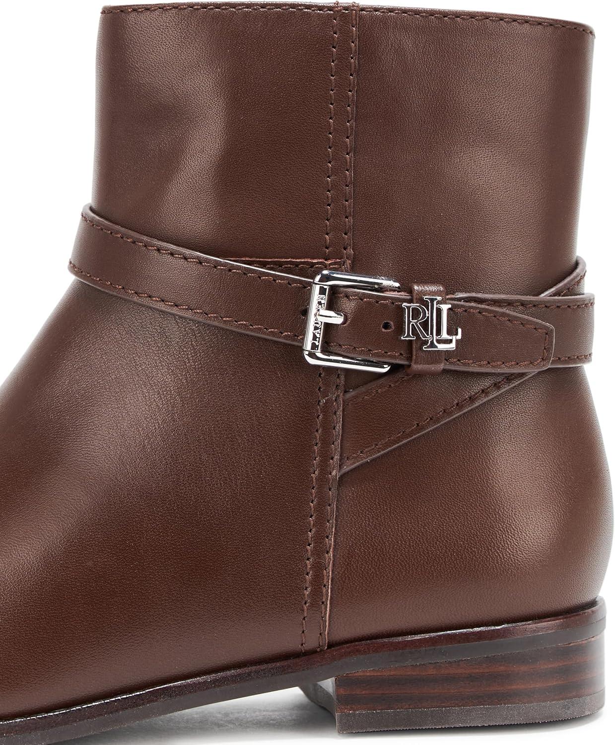 Drawing inspiration from Ralph Lauren’s iconic riding boot designs, the Brooke bootie is defined by a streamlined silhouette, a stacked leather heel, and a crisscross ankle strap with an “LRL” metal keeper. A seasonal essential, this style is crafted with luxuriously smooth calfksin, enhancing its sophisticated appeal.0.5″ (15 mm) heel height. 5.25″ (13.25 cm) shaft height. 11″ (28 cm) shaft opening circumference.Rounded toe.Side zip closure. Buckled crisscross ankle strap with a polished “LRL” metal keeper.Padded insole.Buffed leather outsole.Stacked leather heel.Upper: leather. Lining: leather, cotton, polyurethane.Clean by a leather specialist.Imported.Vietnam