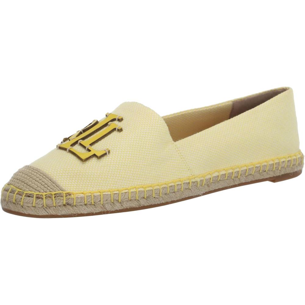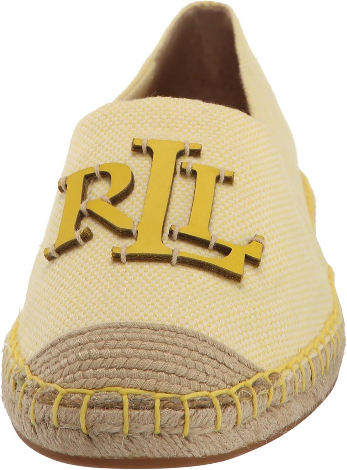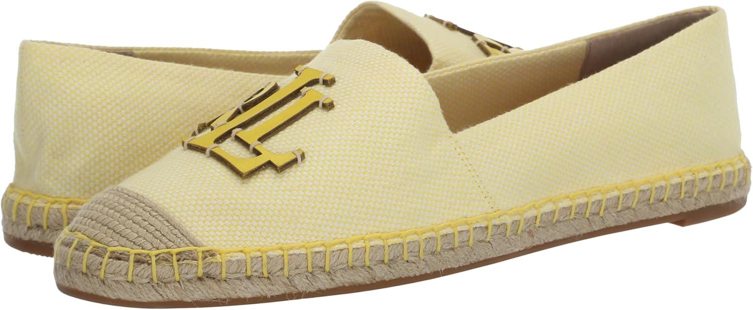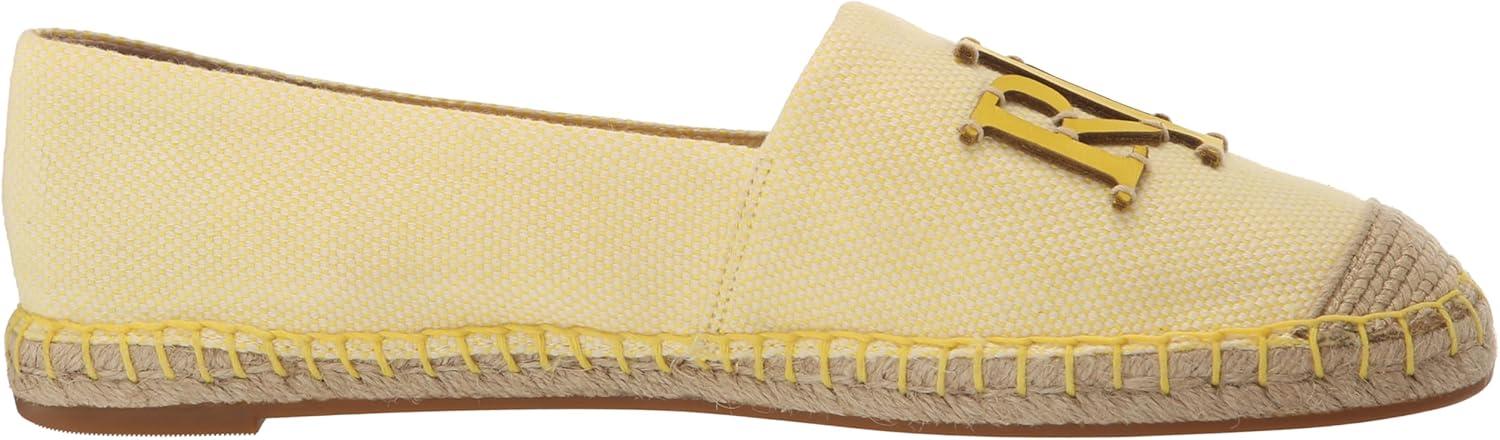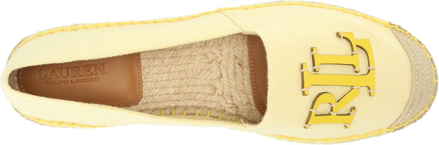 A must-have for the warm-weather season, this iteration of the Cameryn espadrille is crafted with durable cross-dyed canvas and trimmed with an oversize leather “LRL” logo at the vamp. It’s detailed with blanket stitching for an artisanal feel. 0.75″ (20 mm) heel height. Rounded toe. Crocheted toe cap. Slip-on styling. Oversize leather “LRL” logo at the vamp. Padded forepart and leather sock patch with a “Lauren Ralph Lauren”–debossed logo. Jute-and-rubber outsole. Upper and toe cap: cotton. Logo trim: leather. Lining: leather, cotton. Wipe clean with a soft, dry cloth. Imported.