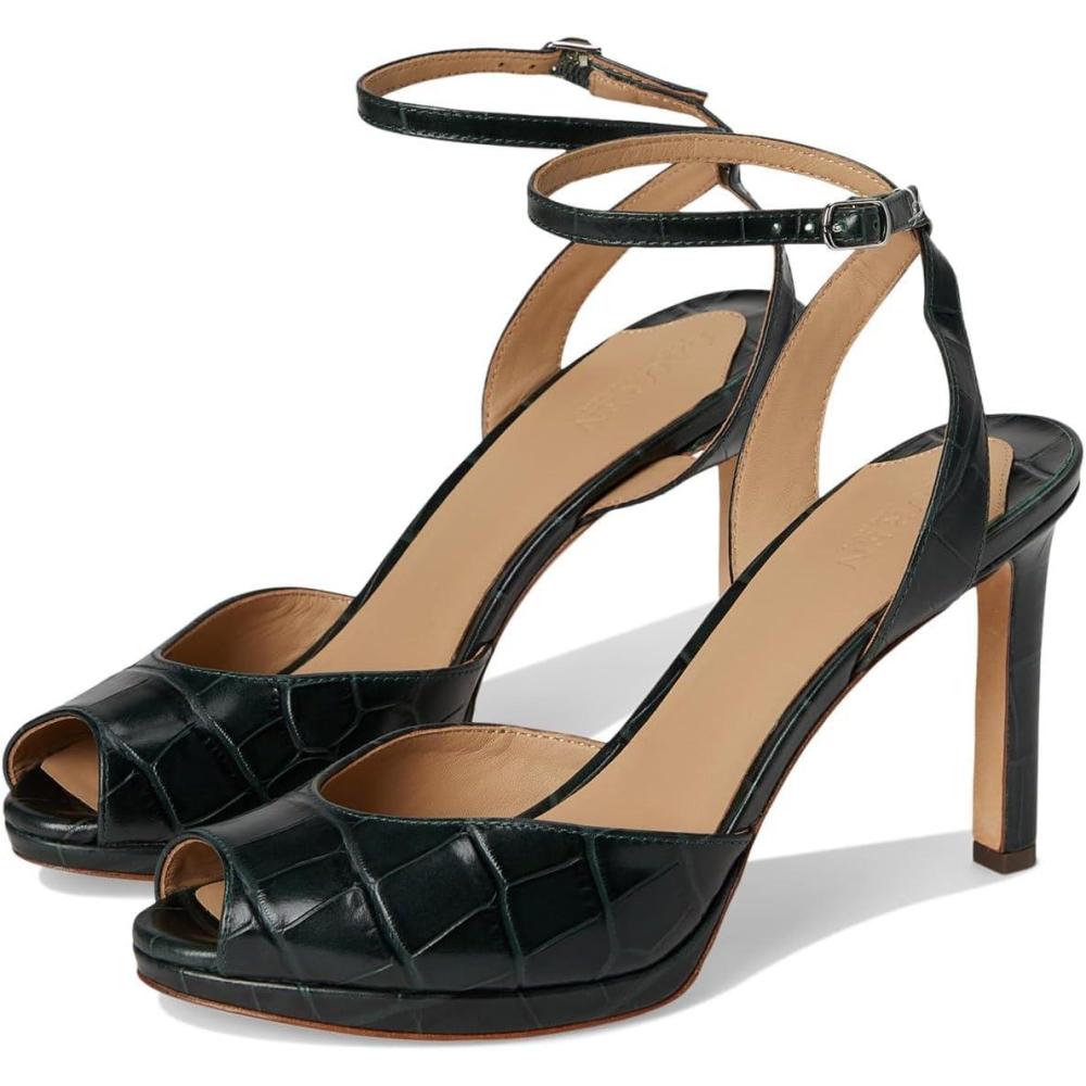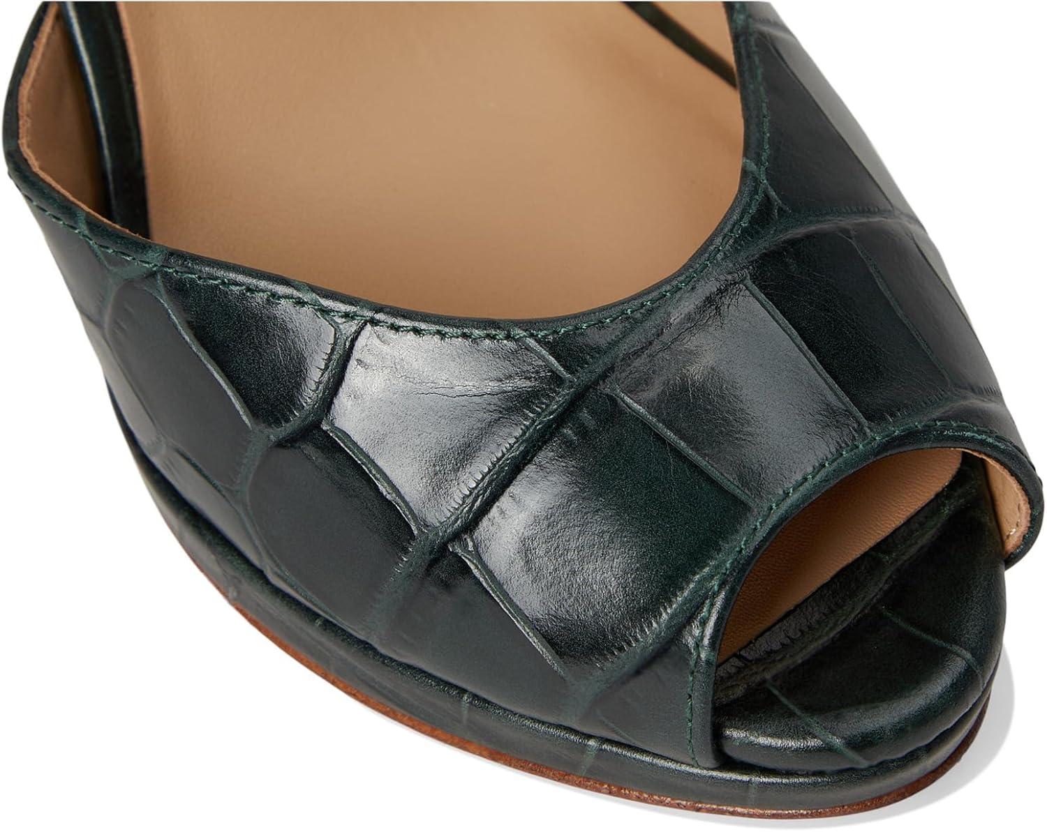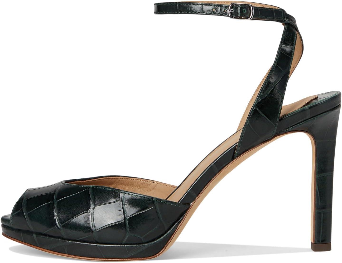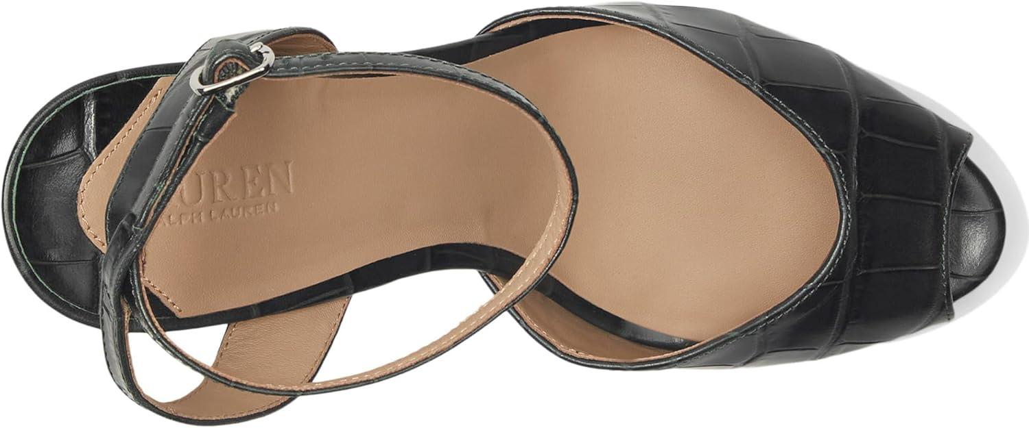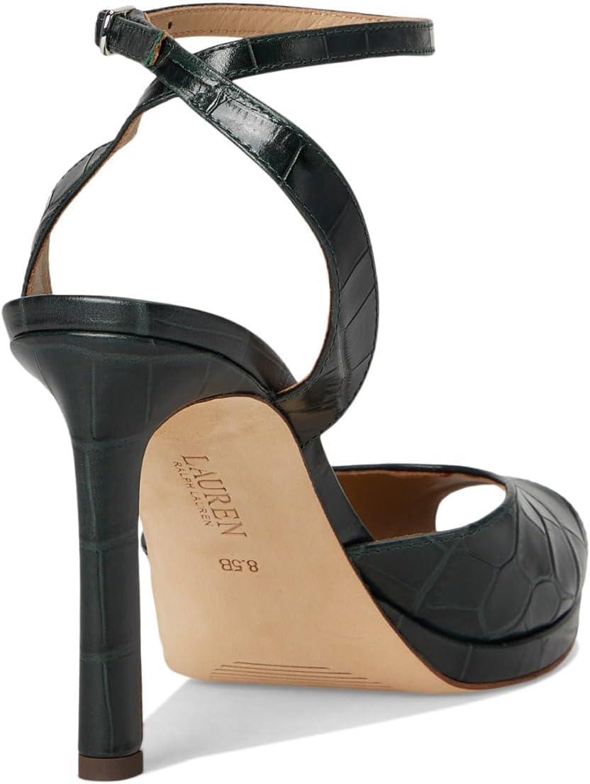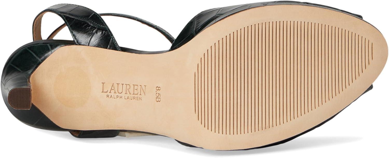 Glossy crocodile-embossed leather brings subtle dimension and a luxurious sensibility to the Lauren Ralph Lauren Kyla Crocodile-Embossed Leather Sandals, which is equipped with stiletto heels for a leg-elongating effect. A crisscross ankle strap and peep toe design add modern appeal, while padded insole offers comfort with each step. Leather upper and lining. Ankle strap with buckle closure. Leather outsole.